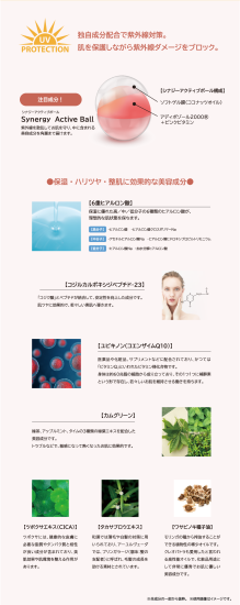 新配合の光老化予防カプセル「シナジーアクティブボール」を筆頭に、「アディポゾール2000」「カムグリーン」「6重ヒアルロン酸」などの成分が、爽やかでしっとりとしたお肌に導きます。